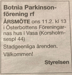 Botnia Parkinsonförening grundades år 1999 och omfattar hela svenska Österbotten. För närvarade har föreningen ca 160 medlemmar.